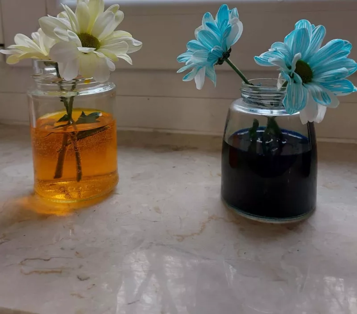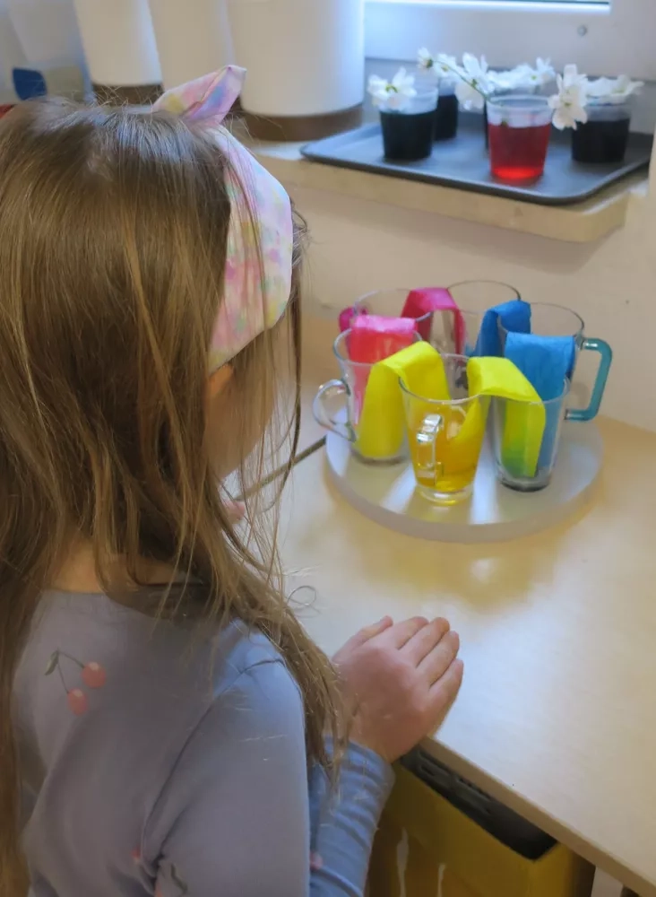 W ostatnich dniach odkrywaliśmy tajemnice wody. Dzieci przelewały wodę do różnych naczyń, porównywały jej ilość oraz sprawdzały, gdzie jest jej więcej, mniej lub tyle samo. Mieszały także kolory wody, obserwując powstające barwy. Sprawdzaliśmy, jak zmieni się kolor białego kwiatka włożonego do barwionej wody oraz jak kolorowa woda „wędruje” przez papierowe ręczniki niczym most między szklankami, tworząc piękne, kolorowe efekty