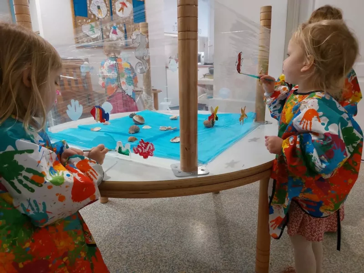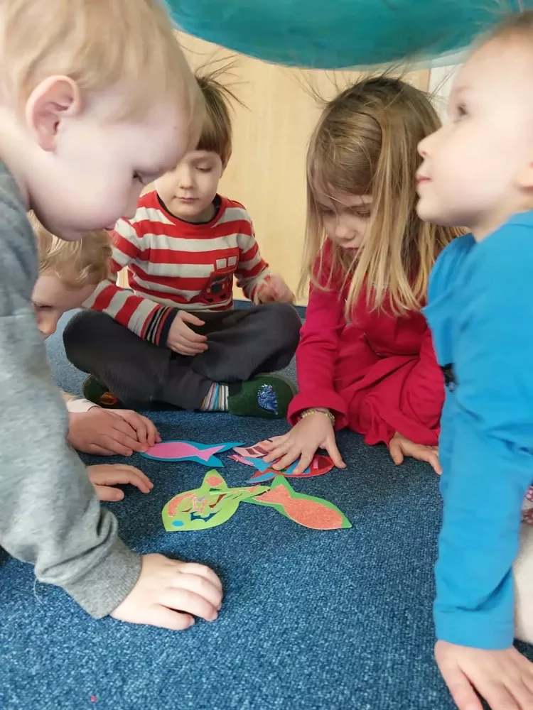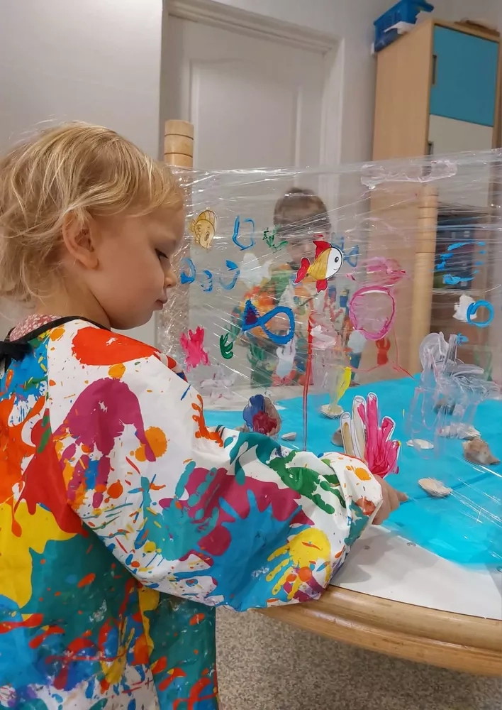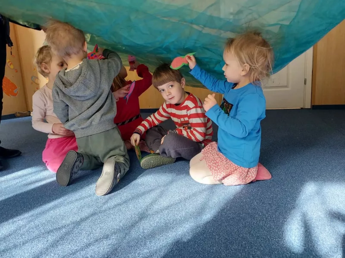 Pozostając w wodnym klimacie, zmieniliśmy również nieco naszą salę. Z odwróconego stolika i folii stretch stworzyliśmy małe „akwarium”, które ozdobiliśmy muszlami i wodnymi roślinami. Na jego ściankach dzieci malowały wodorosty, rybki i inne morskie stworzenia. Na koniec bawiliśmy się przy muzyce papierowymi rybkami w morskich głębinach z pięknego, niebieskiego materiału.